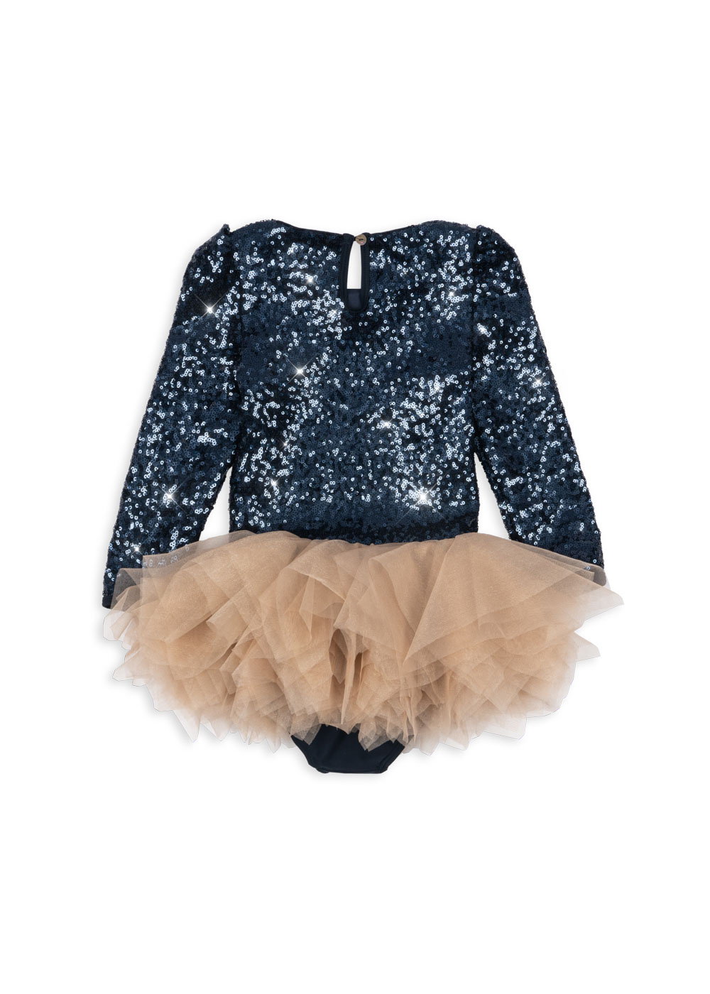 Klassisches Tutu-Kleid für kleine Ballerinas. Entworfen mit einem voluminösen Tüllrock, der an einem eng anliegenden Anzug aus dehnbarem Performance-Stoff befestigt ist. Abgeschlossen mit dekorativen, ganzlagigen Pailletten.