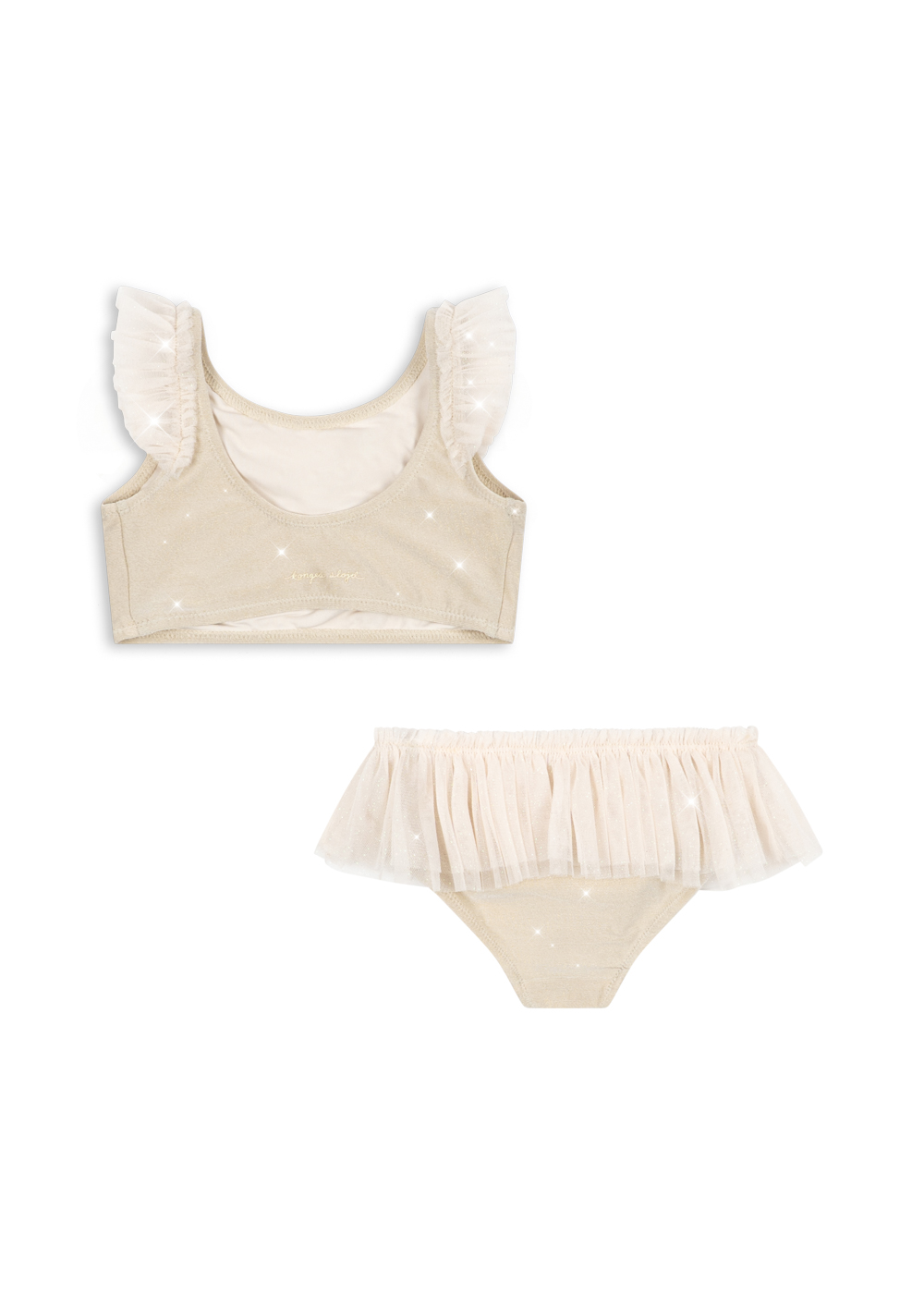 Weicher Bikini mit einem glitzernden Finish mit Tülldetails. Das Unterteil hat ein voluminöses Tülldetail.