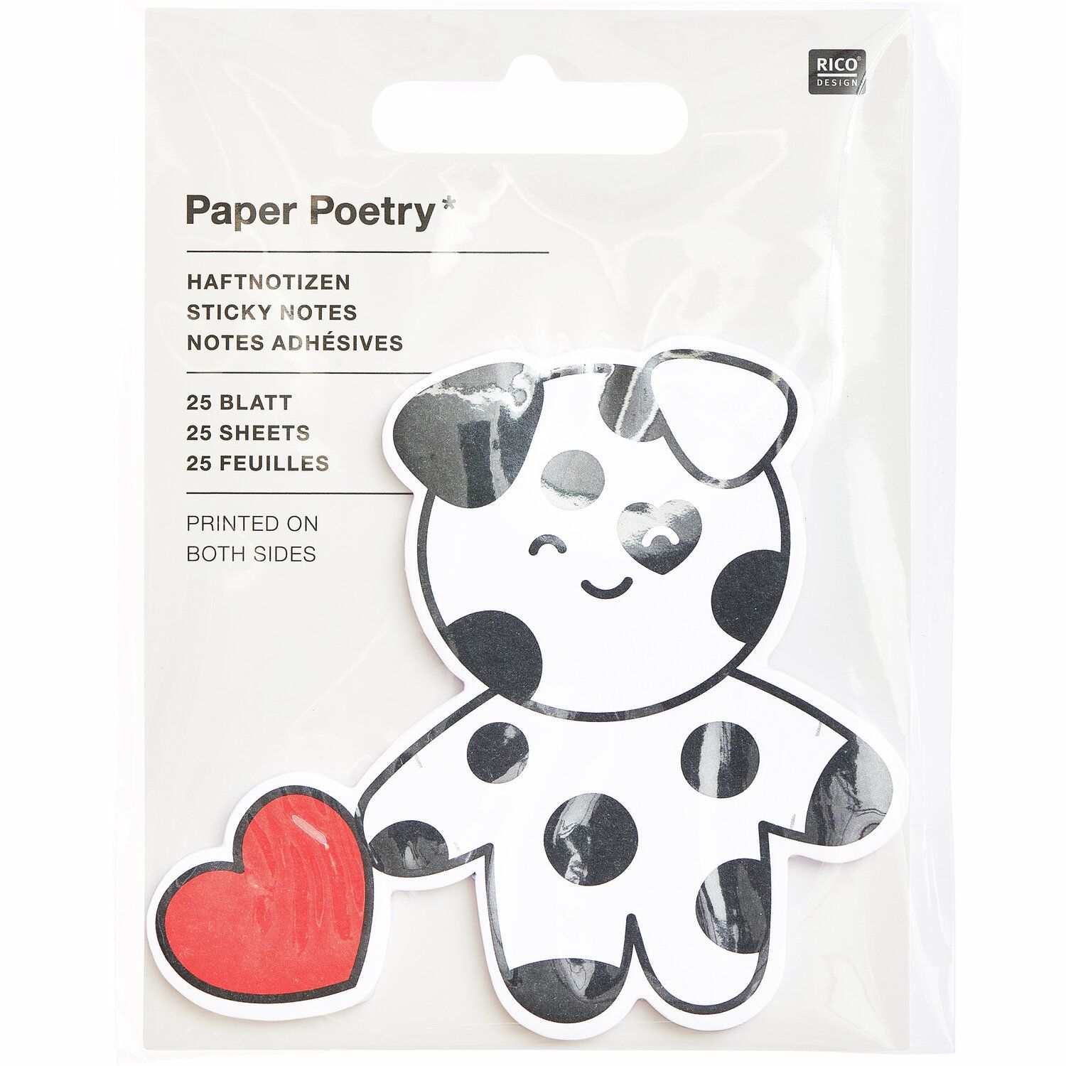 Die Haftnotizen Dalmatiner sind beidseitig bedruckt und ermöglichen eine spielerische Art, kurze Notizen oder Botschaften zu platzieren. Durch die vorgedruckten Faltlinien lassen sich die Arme nach vorne klappen, sodass sich Hinweise oder Nachrichten dekorativ verdecken lassen. Jede Packung enthält 25 Blatt in einem handlichen Format und eignet sich sowohl für den Schreibtisch als auch für kreative Mitteilungen im Alltag.