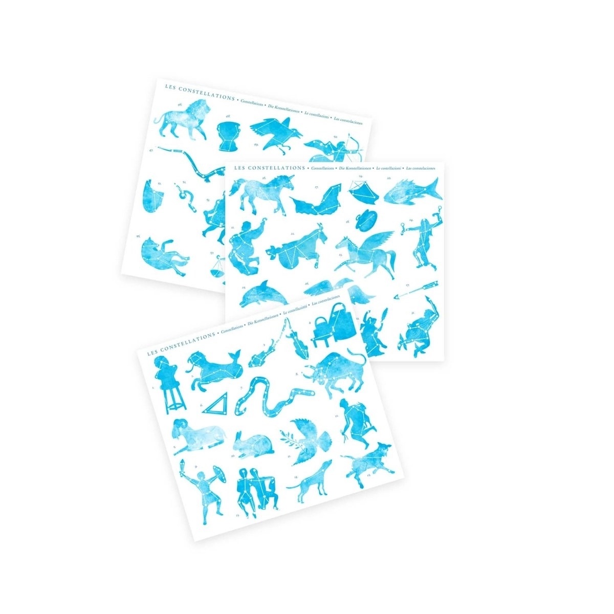 Auf der Himmelskarte können verschiedene Sternbilder platziert werden. Dazu gibt es 4 Bögen mit Rubbelbildern, ein Poster mit Sternbildern und Stern-Sticker, die im Dunkeln leuchten.