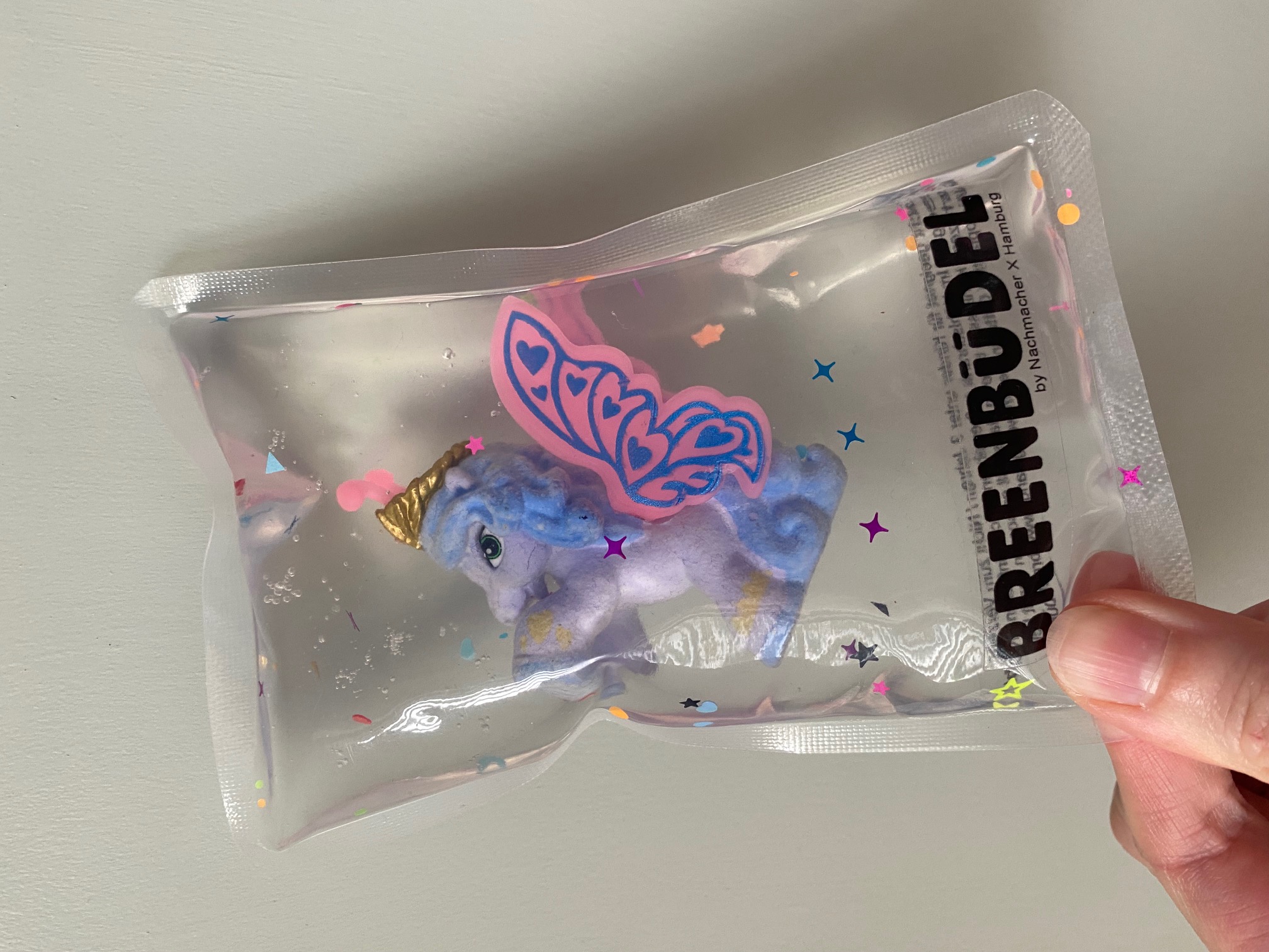 - Breenbüdel bestehen aus einer lebensmittelechten Folie, Glitzerpartikeln, wiederverwerteten Spielzeugen und einer glykolfreien, kompostierbaren Kühlfüllung