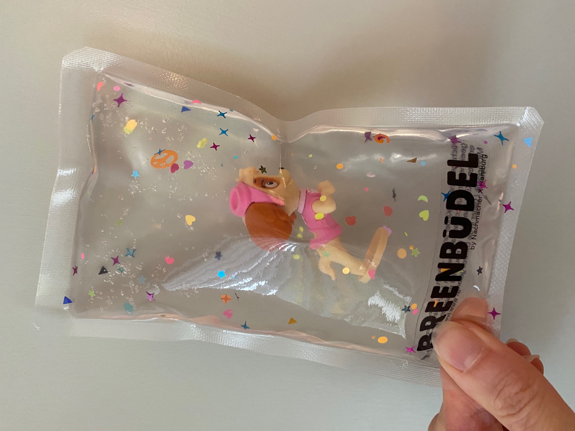 • Breenbüdel bestehen aus einer lebensmittelechten Folie, Glitzerpartikeln, wiederverwerteten Spielzeugen und einer glykolfreien, kompostierbaren Kühlfüllung
