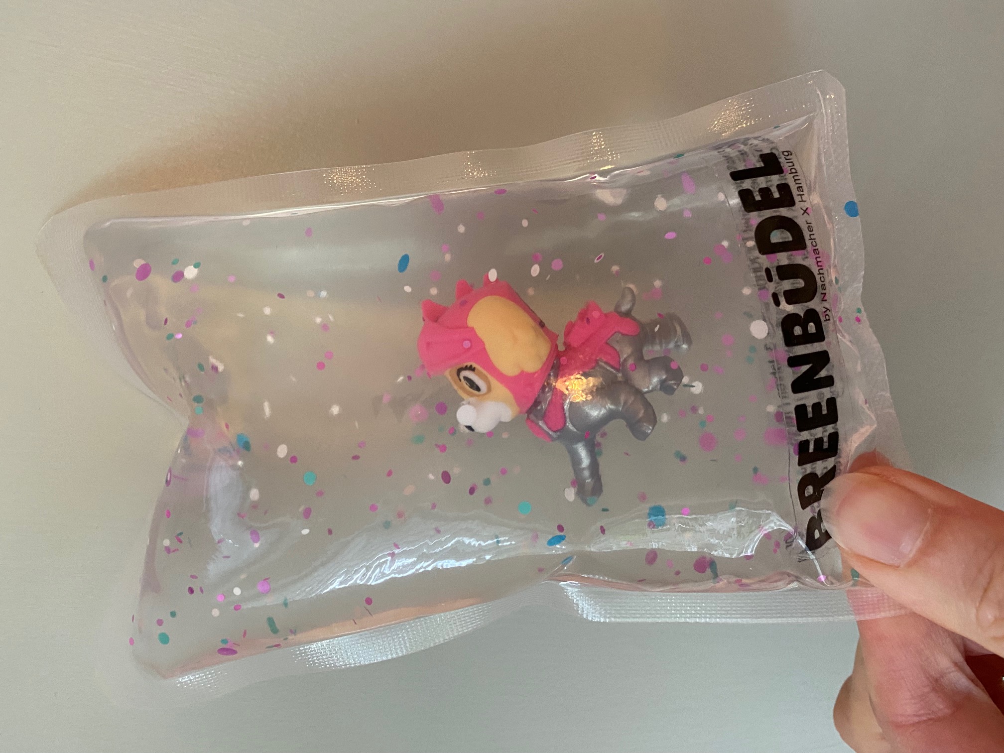 • Breenbüdel bestehen aus einer lebensmittelechten Folie, Glitzerpartikeln, wiederverwerteten Spielzeugen und einer glykolfreien, kompostierbaren Kühlfüllung