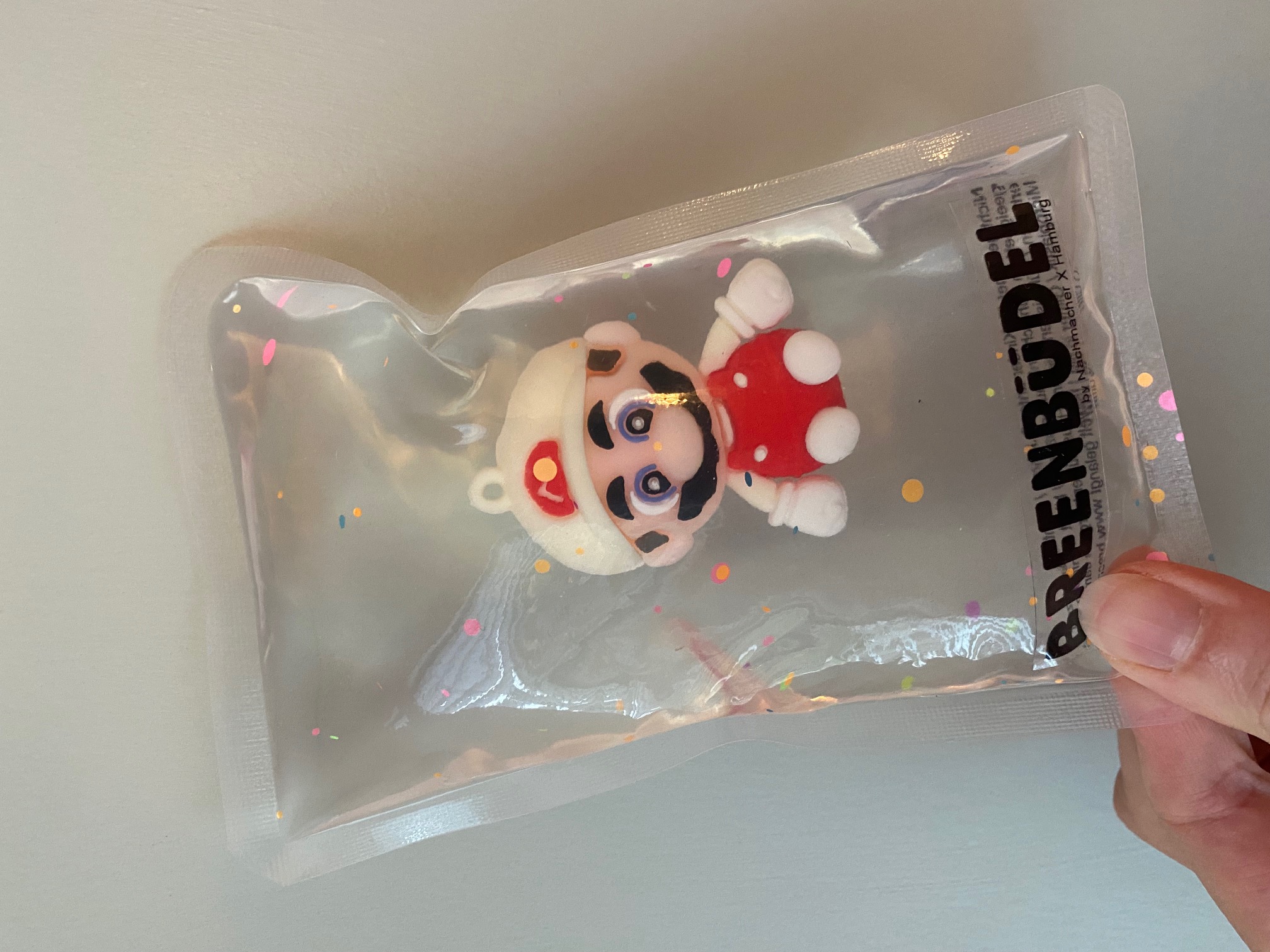- Breenbüdel bestehen aus einer lebensmittelechten Folie, Glitzerpartikeln, wiederverwerteten Spielzeugen und einer glykolfreien, kompostierbaren Kühlfüllung