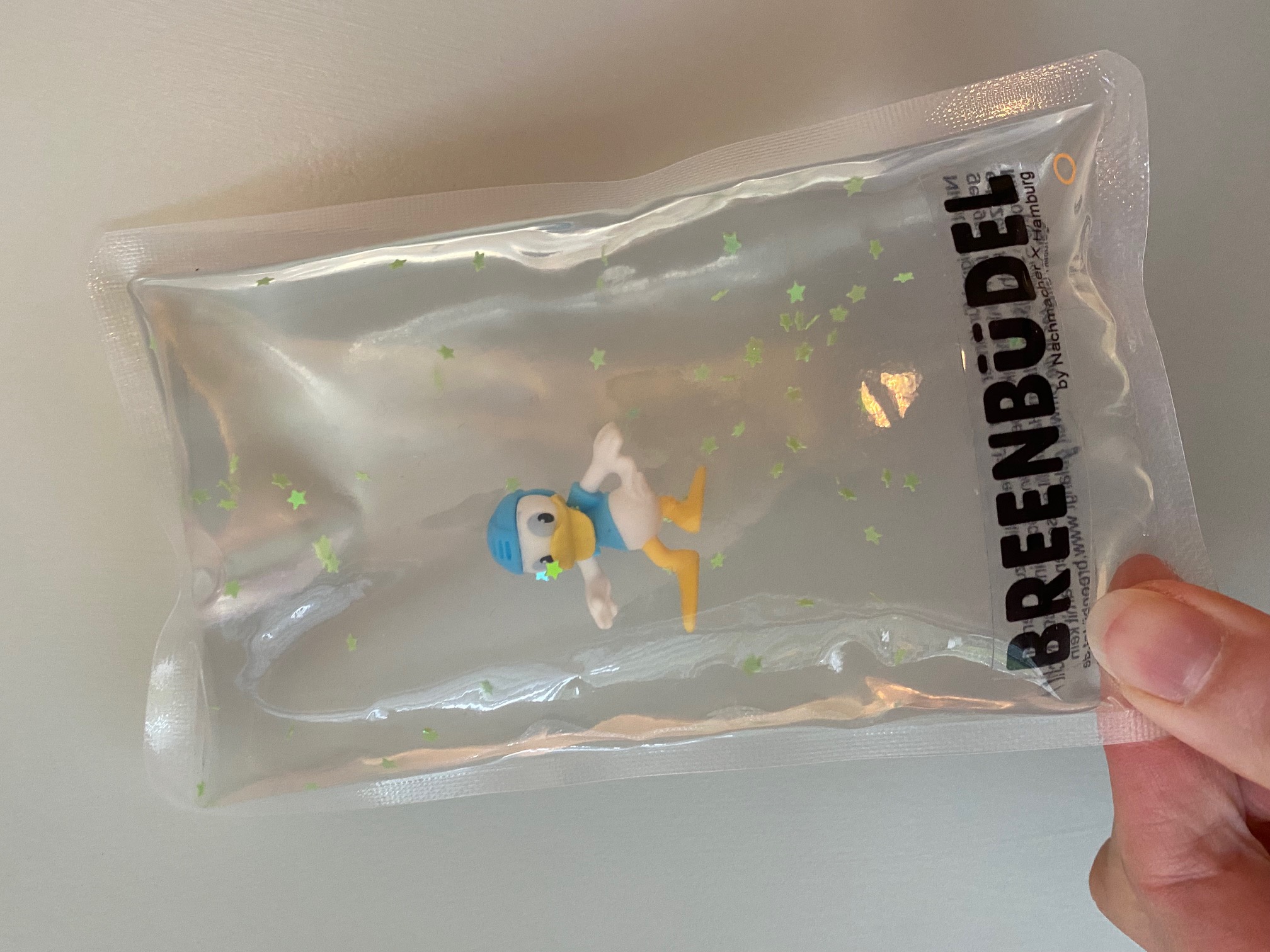 - Breenbüdel bestehen aus einer lebensmittelechten Folie, Glitzerpartikeln, wiederverwerteten Spielzeugen und einer glykolfreien, kompostierbaren Kühlfüllung