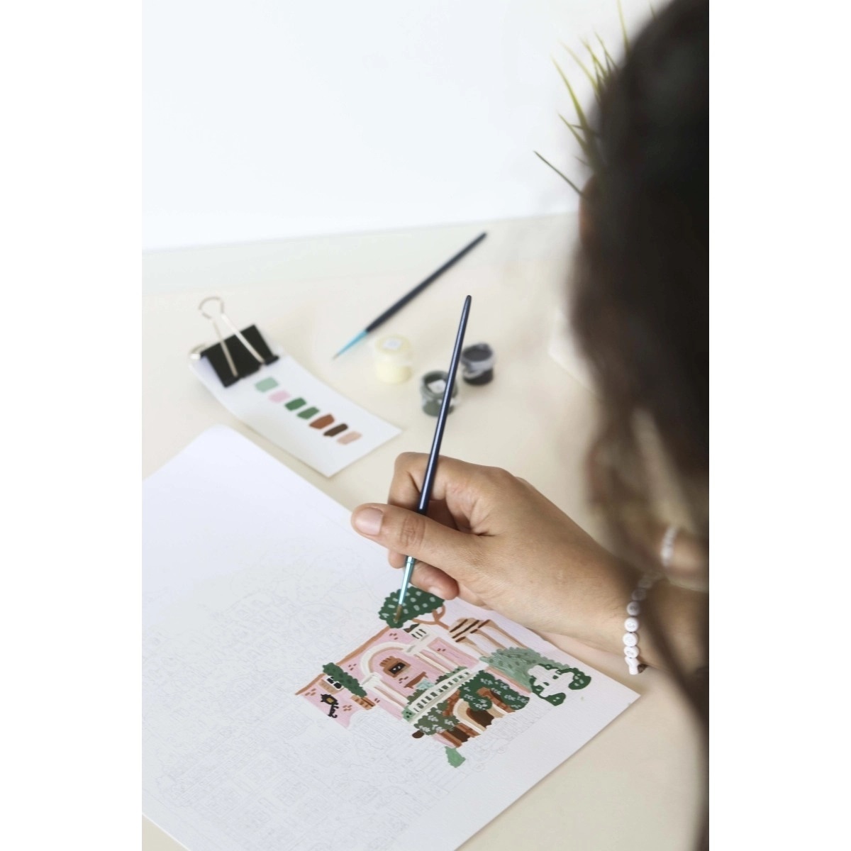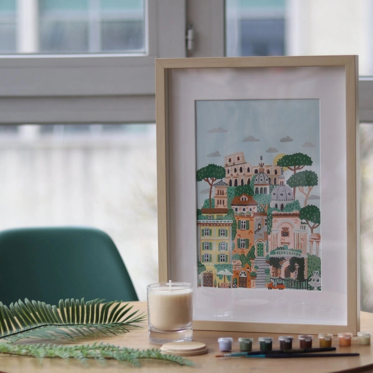 Diese kreative Aktivität begeistert Kinder ebenso wie Erwachsene – und das aus gutem Grund: Sie verbindet Ruhe, Konzentration und Freude am Gestalten. Die sanfte, pastellfarbene Illustration von Hoglet & Co zeigt die zeitlose Schönheit Roms.