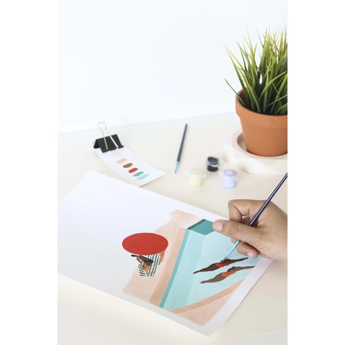 Die Illustration, entworfen von der französischen Künstlerin Léa Morichon, fängt die sonnige Stimmung eines paradiesischen Ortes ein. Die Malvorlage ist in nummerierte Bereiche unterteilt – einfach Farbe auswählen, Fläche ausmalen und Schritt für Schritt ein strahlendes Kunstwerk entstehen lassen.