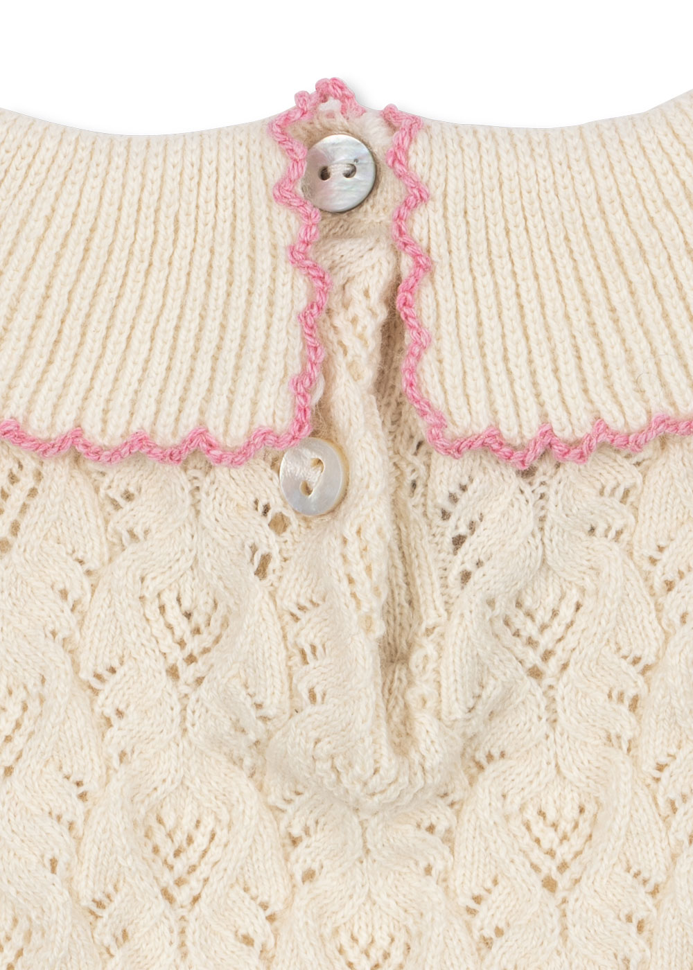 Wunderschöner gestrickter, kurzärmeliger Strampler aus einer unglaublich weichen Mischung aus Kaschmir, Wolle und Baumwolle mit Rosen-Details.