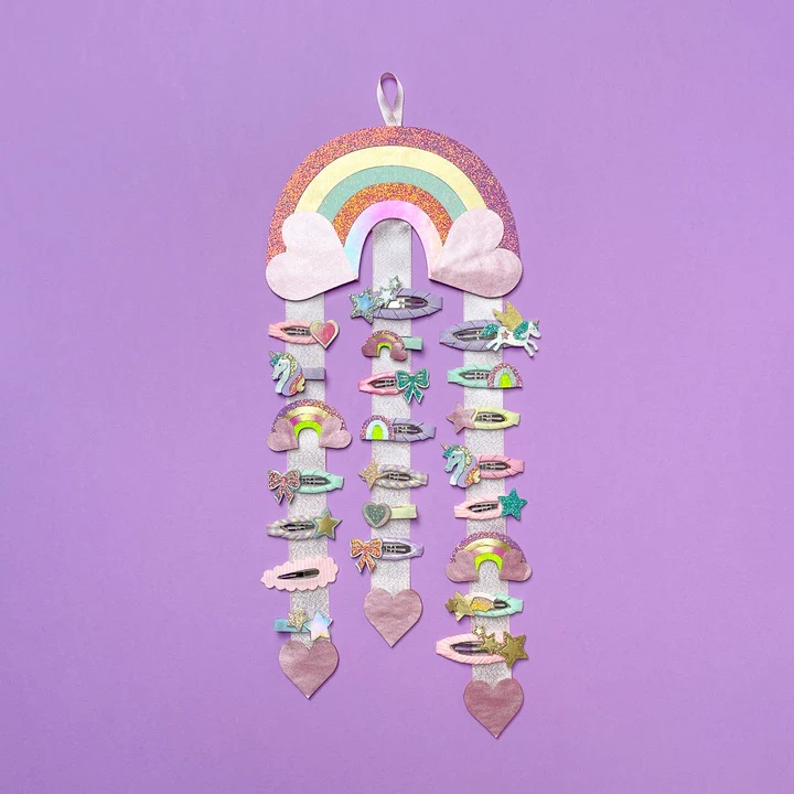 Mimi und Lula freuen sich, Ihnen unseren schimmernden neuen Rainbow-Haarclip-Wandbügel zu präsentieren! Die schönste Lösung, um ihre wachsende Clip-Sammlung zu präsentieren!